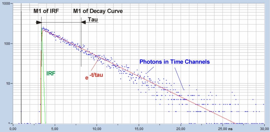 上述等式中的時(shí)間t,是光子在FLIM系統(tǒng)的觀測(cè)時(shí)間間隔內(nèi)的時(shí)間,而不是從激發(fā)脈沖之后的時(shí)間。因此,必須減去激發(fā)時(shí)間(在實(shí)踐中是IRF的一階矩)才能得到熒光壽命τ: