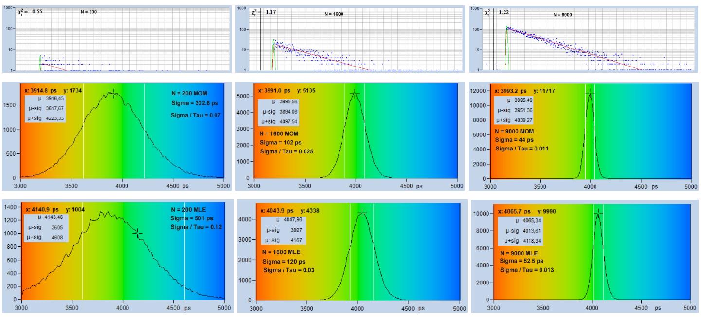 圖 7:SQRT (N) 關(guān)系的驗(yàn)證。頂行:來自羅丹明110染料溶液的FLIM數(shù)據(jù)單個(gè)像素的衰減曲線。從左到右:N = 200個(gè)光子,N = 1600個(gè)光子,N = 9000個(gè)光子。第二行:通過一階矩方法分析獲得的壽命直方圖。底行:通過 MLE 分析獲得的壽命直方圖。
