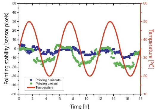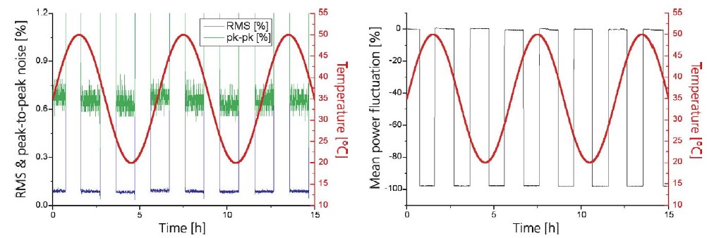 圖1:上左圖:HTCure工藝的激光器在20-50℃溫度擾動(dòng)下的噪聲表現(xiàn); 上右圖: HTCure工藝的激光器在20-50℃溫度擾動(dòng),及快速開關(guān)下的功率穩(wěn)定性表現(xiàn)。下圖:HTCure工藝的激光器在20-50℃溫度擾動(dòng)下,指向穩(wěn)定性的測(cè)試數(shù)據(jù)(< 4 μrad/℃)。